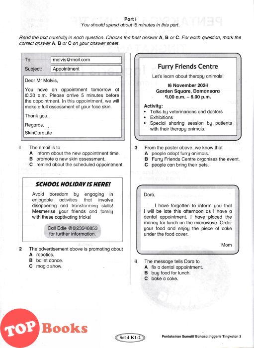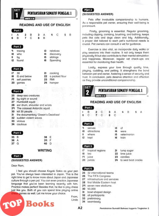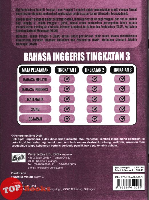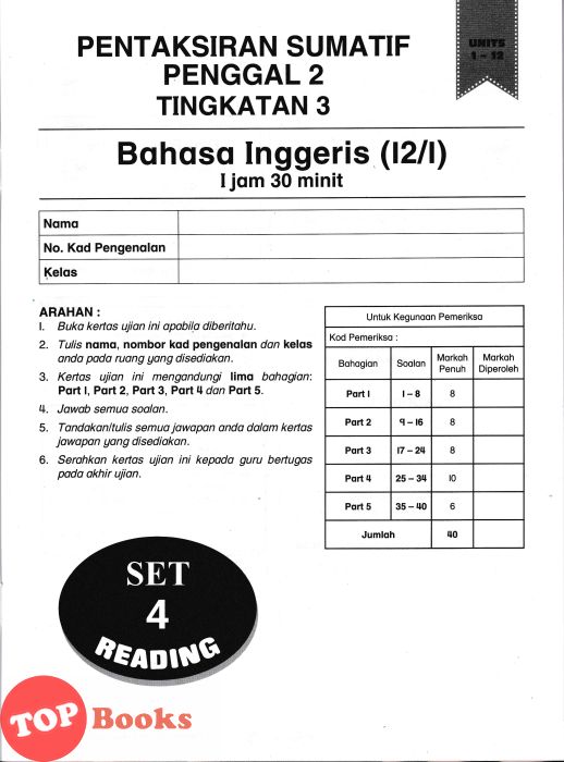 Buku ini terdiri daripada empat set kertas soalan, iaitu dua set soalan bagi penggal 1 dan dua set soalan bagi penggal 2. soalan penggal 1 (UPSA) sesuai untuk pentaksiran pertengahan untuk kerana memfokuskan sebahagian daripada dokumen standard kruikulum dan pentaksiran (DSKP). kurikulum standard sekolah menegah (KSSM).