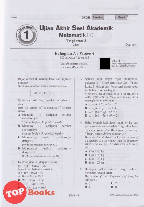 [TOPBOOKS Pelangi] Skor A Kertas Model UASA Matematik Tingkatan 2 KSSM Dwibahasa (2025)