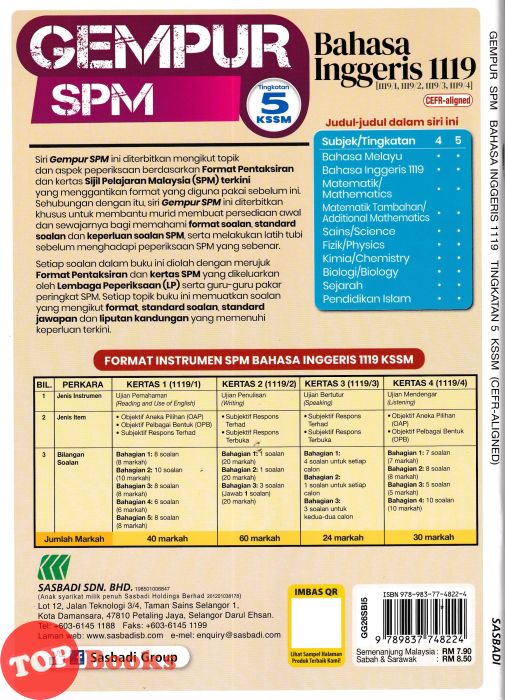 Siri Gempur SPM Ini Diterbitkan Mengikut Topik Dan Aspek Peperiksaan Berdasarkan Format Pentaksiran Dan Kertas Sijil Pelajaran Malaysia (SPM) Terkini Yang Menggantikan Format Yang Diguna Pakai Sebelum Ini. Sehubungan Dengan Itu, Siri Gempur SPM Ini Diterbitkan Khusus Untuk Membantu Murid Membuat Persediaan Awal Dan Sewajarnya Bagi Memahami Format Soalan, Standard Soalan, Keperluan Soalan SPM Serta Melakukan Latih Tubi Sebelum Menghadapi Peperiksaan SPM Yang Sebenar