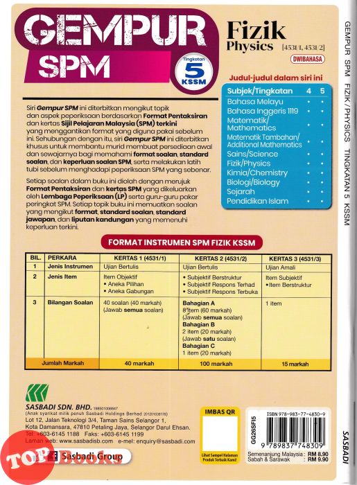 Siri Gempur SPM Ini Diterbitkan Mengikut Topik Dan Aspek Peperiksaan Berdasarkan Format Pentaksiran Dan Kertas Sijil Pelajaran Malaysia (SPM) Terkini Yang Menggantikan Format Yang Diguna Pakai Sebelum Ini. Sehubungan Dengan Itu, Siri Gempur SPM Ini Diterbitkan Khusus Untuk Membantu Murid Membuat Persediaan Awal Dan Sewajarnya Bagi Memahami Format Soalan, Standard Soalan, Keperluan Soalan SPM Serta Melakukan Latih Tubi Sebelum Menghadapi Peperiksaan SPM Yang Sebenar