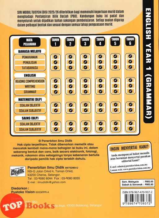 Siri Modul Tusiyen Edisi 2025/26 diterbitkan bagi memenuhi keperluan murid dalam menghadapi Pentaksiran Bilik Darjah (pbd). Kandungan buku ini padat dan menyeluruh untuk dijadikan bahan sokongan pembelajaran, Setiap soalan digarap dalam pelbagai bentuk dan sesuai dengan semua tahap penguasaan murid.