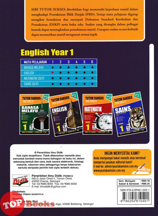 Siri TUTOR SUKSES diterbitkan bagi memenuhi keperluan murid dalam menghadapi pentaksiran Bilik Darjah (PBD). Setiap mata pelajaran digarap mengikut kemahiran dan menepati Dokuman Standard Kurikulum dan Pentaksiran (DSKP) serta buku teks. Soalan yang dirangka dalam pelbagai bentuk dapat meningkatkan pemahaman murid. Garapan soalan secara holistik dapat memastikan murid menguasai semua topik.