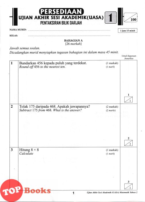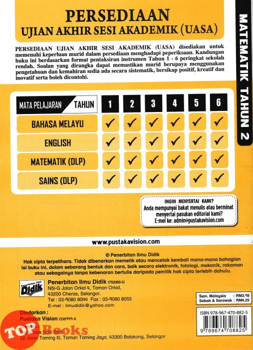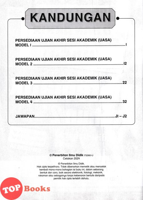 PERSEDIAAN UJIAN AKHIR SESI AKADEMIK (UASA) disediakan untuk memenuhi keperluan murid dalan persediaan menghadapi peperiksaan. Kandungan buku ini berdasarkan format pentaksiran instrumen tahun 1-6 peringkat sekolah rendah. Soala yang dirangka dapat memeastikan murid berupaya menggunakan pengetahuan dan kemahiran sedia ada secara sistematik, bersikap positif, Kreatif dan inovatif serta boleh dicontohi