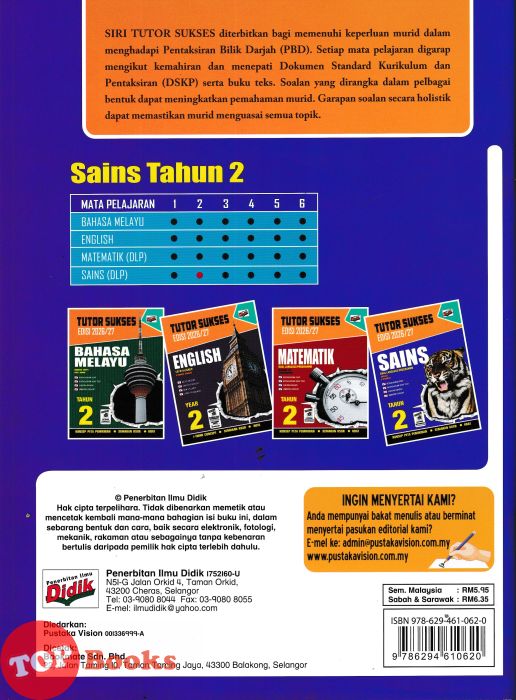 Siri TUTO SUKSES diterbitkan bagi memenuhi keperluan murid dalam menghadapi pentaksiran Bilik Darjah (PBD). Setiap mata pelajaran digarap mengikut kemahiran dan menepati Dokuman Standard Kurikulum dan Pentaksiran (DSKP) serta buku teks. Soalan yang dirangka dalam pelbagai bentuk dapat meningkatkan pemahaman murid. Garapan soalan secara holistik dapat memastikan murid menguasai semua topik.