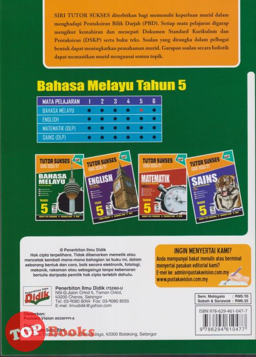 Siri TUTOR SUKSES Diterbitkan Bagi Memenuhi Keperluan Murid Dalam Menghadapi Pentaksiran Bilik Darjah (PBD). Setiap Mata Pelajaran Digarap Mengikut Kemahiran Dan Menepati Dokuman Standard Kurikulum Dan Pentaksiran (DSKP) Serta Buku Teks. Soalan Yang Dirangka Dalam Pelbagai Bentuk Dapat Meningkatkan Pemahaman Murid. Garapan Soalan Secara Holistik Dapat Memastikan Murid Menguasai Semua Topik.