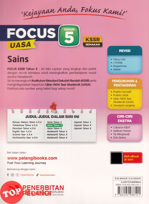 FOCUS KSSR Tahun 5 - siri teks rujukan yang lengkap dan padat dengan ciri-ciri istimewa untuk meningkatkan pembelajaran murid secara menyeluruh. Siri ini merangkumi Kurikulum Standard Sekolah Rendah (KSSR) Yang Baharu serta mengintegrasikan keperluan Ujian Akhir Sesi Akademik (UASA). Pastinya satu sumber yang hebat bagi setiap murid.