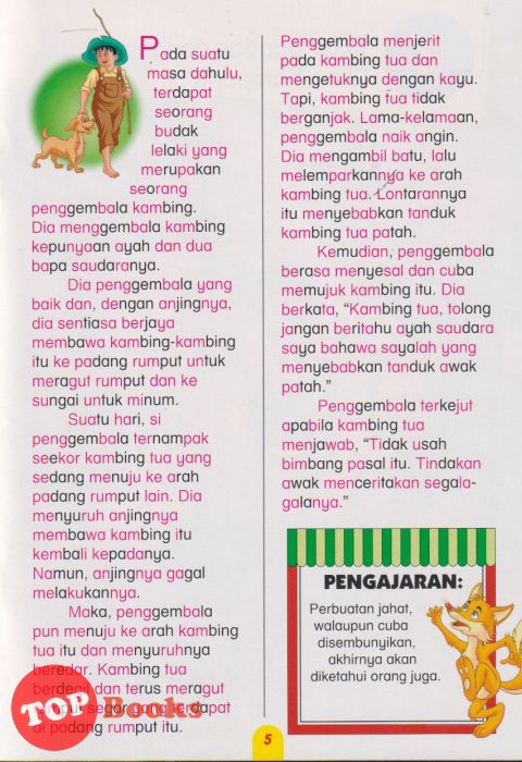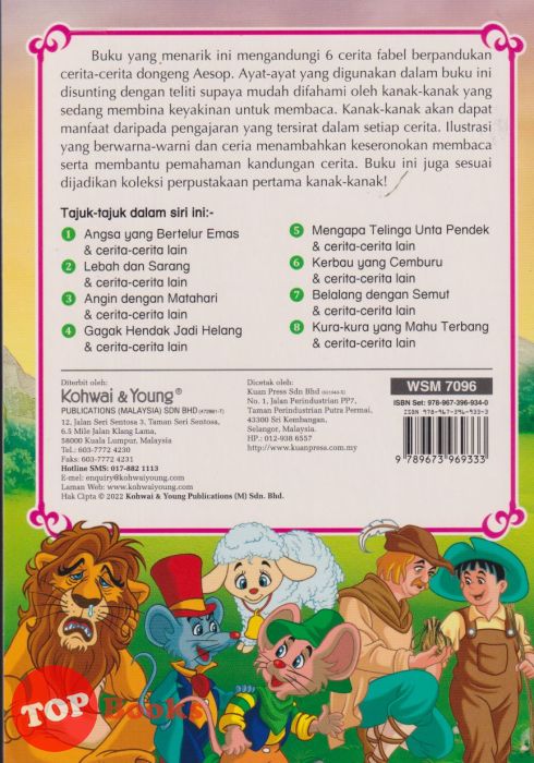 Buku Yang Menarik Ini Mengandungi 6 Cerita Fabel Berpandukan Cerita-Cerita Dongeng Aesop. Ayat-Ayat Yang Digunakan Dalam Buku Ini Disunting Dengan Teliti Supaya Mudah Difahami Oleh Kanak-Kanak Yang Sedang Membina Keyakinan Untuk Membaca. Kanak-Kanak Akan Dapat Manfaat Daripada Pengajaran Yang Tersirat Dalam Setiap Cerita. Ilustrasi Yang Berwarna-Warni Dan Ceria Menambahkan Keseronokan Membaca Serta Membantu Pemahaman Kandungan Cerita. Buku Ini Juga Sesuai Dijadikan Koleksi Perpustakaan Pertama Kanak-Kanak!