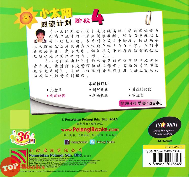 《小太阳阅读计划》是为提高幼儿学前阅读能力 而精心设计的一系列阅读教材,适合3岁或以上 的小朋友阅读。本系列分成4个阶段,通过两个 主人翁的生活片段由浅入深地介绍500个字。系列中 的汉语拼音、象形文字、词汇及句子的再现法都能让幼 儿轻松地识别汉字的音、形、义。